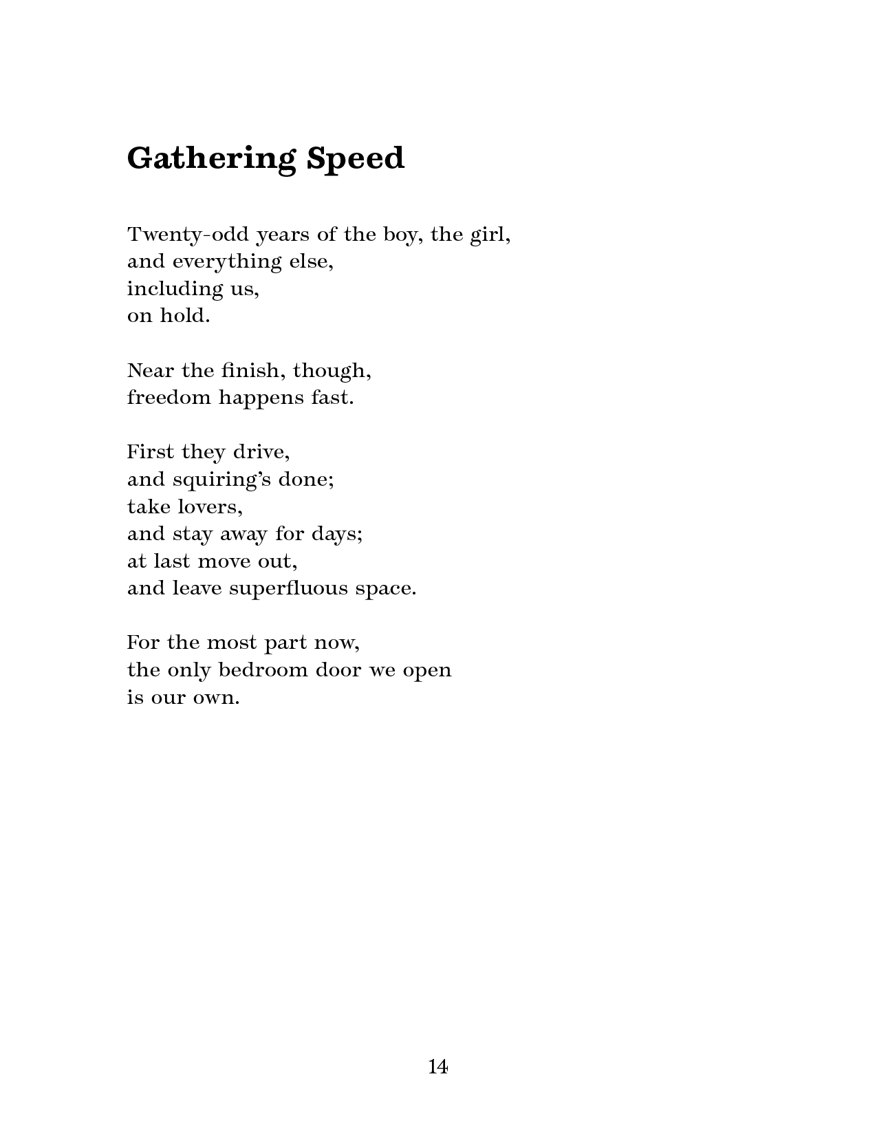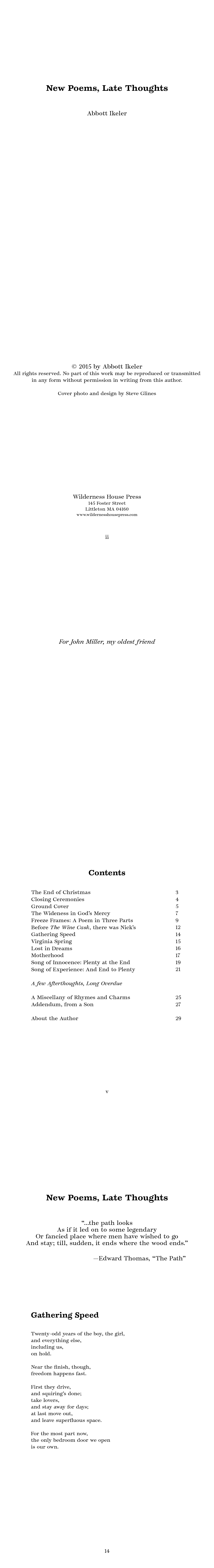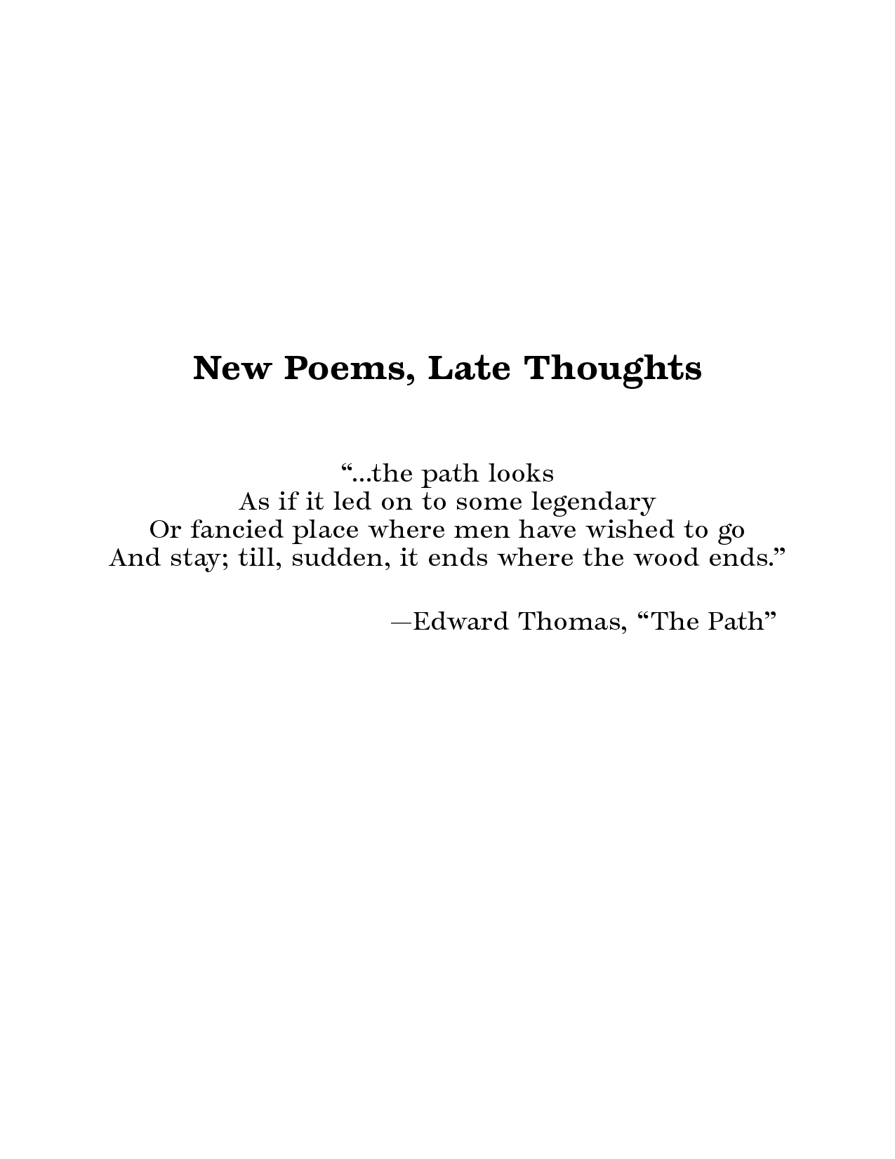 From “The End of Christmas” to “Plenty,” New Poems, Late Thoughts reflects on the simpler, quieter life that empty-nesting brings. The poet’s eye catches much that is missed in the midstream rush: the mad proliferation of a nameless plant, an old dog’s nightly ritual, the place where Christmas trees go to die. There are bedroom doors he no longer opens, but grandchildren who come and open his.